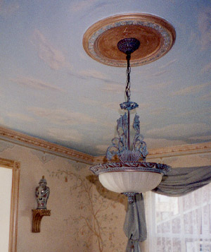 This ceiling was realistically rendered in oil paints. The effect adds more depth and atmosphere to any space.